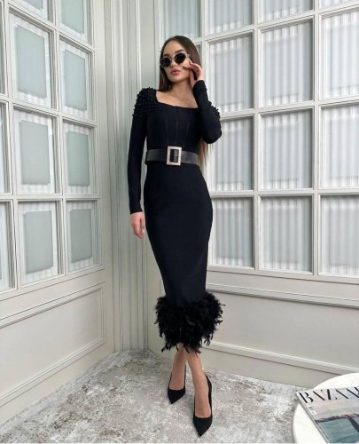 Kadın etek ucu otriş yakası inci detayli midi boy elbise